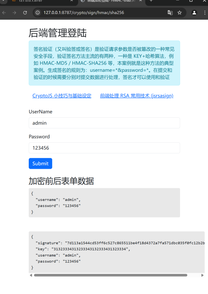 使用 HMAC-SHA256 算法对username和password的组合字符串进行签名,并将结果转换为十六进制字符串