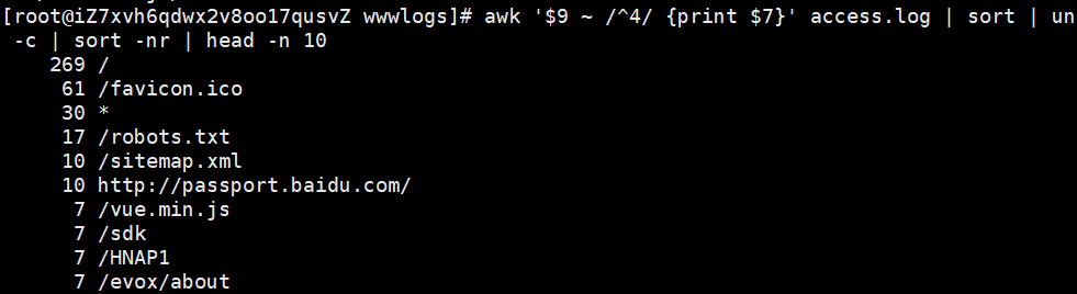 awk '$9 ~ /^4/ {print $7}' access.log | sort | uniq -c | sort -nr | head -n 10